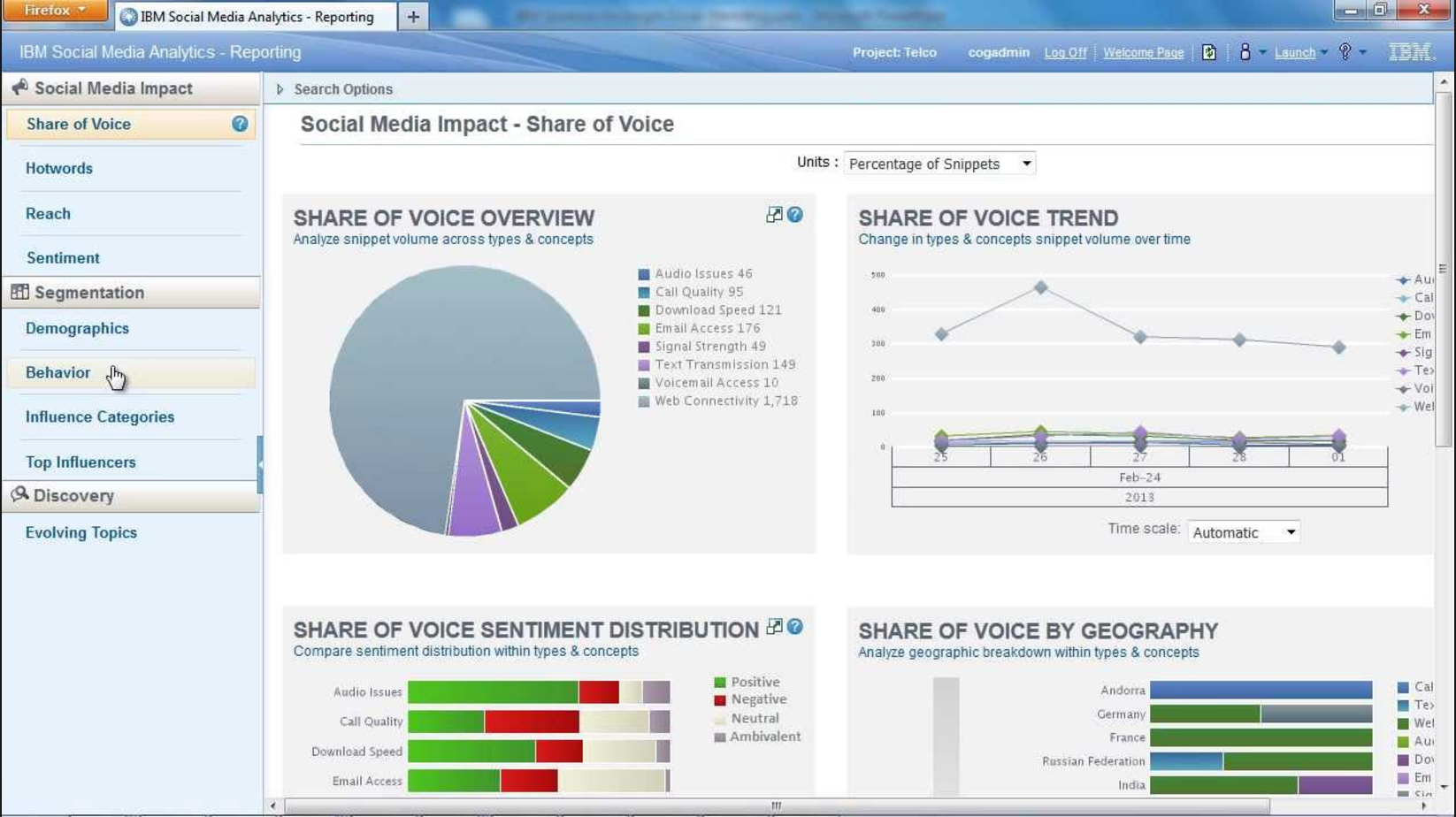 IBM Social Media Analytics is a powerful tool for discovering customer sentiment from millions of online sources. Businesses are using the power of social media to gain a better understanding of their markets. However, they need deep analytics expertise to transform this "Big Data" into actionable insight. The goal of SMA was to help customers harness social data and take decisive action across the enterprise. The goal of our team, was to make the process of configuration and analysis seamless and easier to input segments to help anticipate new business opportunities.